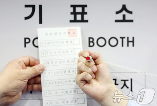 제21대 대통령 선거일인 3일 서울 영등포구 여의도 윤중중학교에 마련된 투표소를 찾은 시민이 투표용지에 기표하고 있다. 2025.6.3/뉴스1 ⓒ News1 이승배 기자 |