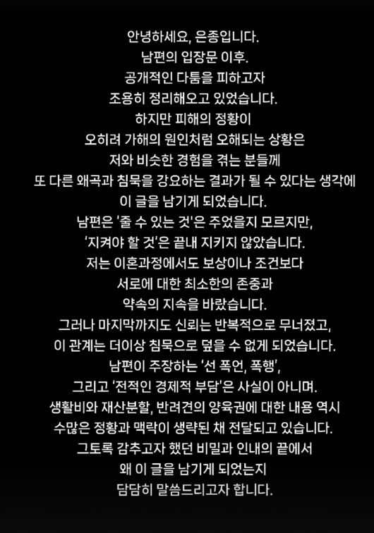 앞서 은종은 지난 12일, 약 1년간의 법정 싸움 끝에 상간소송에서 승소했다는 사실을 알리며 “외도와 폭력으로 인해 더 이상 결혼생활을 유지할 수 없었다”고 고백했다. 협의 이혼 절차를 진행 중이라는 사실도 공개했다.