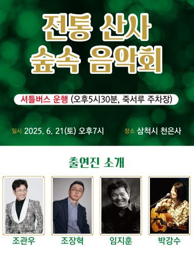 강원 삼척시는 21일 지역의 문화유산과 자연이 어우러지는 특별한 무대인 ‘전통 산사 숲속 음악회’를 개최한다고 밝혔다.