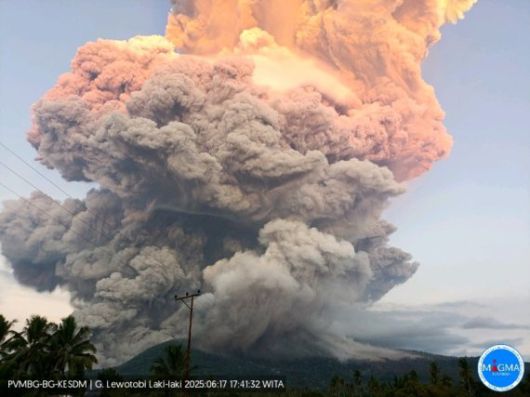 6월17일 오후 5시35분 인도네시아 동누사?가라(NTT) 지역의 르워토비 라키라키 화산이 분화했다. 분화로 인해 화산재 기둥은 화산 정상에서 약 10km 높이(해발 약 1만1584m)까지 치솟았고 짙은 회색 화산재가 대기 중으로 광범위하게 확산되는 모습이 관측됐다./사진=인도네시아 에너지광물자원부 지질청 화산·지질재난방지센터(PVMBG) 제공 |
