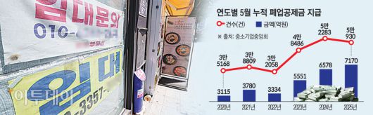 폐업공제금 지급 건수는 5만930건으로 지난해 같은 기간(5만2283건)보다 줄어든 것을 고려하면 그만큼 오래 버텨온 소상공인들이 무너지는 사례가 늘어난 것으로 풀이된다.