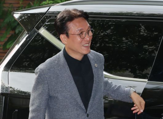 김민석 국무총리 후보자가 18일 서울 종로구 통의동 금융감독연수원에 마련된 청문회 준비단 사무실로 출근하고 있다. /연합 |