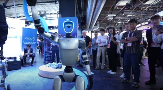 < 관람객들이 휴머노이드 로봇의 시연을 흥미롭게 지켜보고 있다>