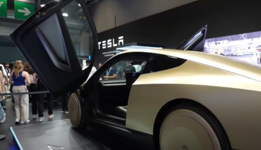< 관람객들이 운전대와 페달이 없는 테슬라의 미래형 로보택시 '사이버캡'을 살펴보고 있다>