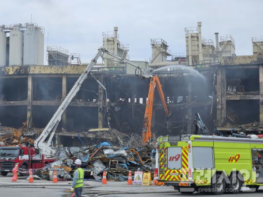 ▲22일 광주 광산구 소촌동 금호타이어 광주공장 현장에서 중장비로 제2공장 화재발생현장 쪽으로 철거가 진행 중이다.2025.05.22ⓒ프레시안(김보현) |