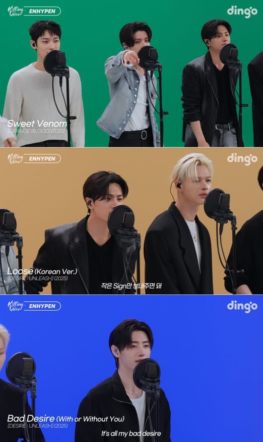 공개된 영상 속에서 엔하이픈은 "어렸을 때부터 딩고 '킬링 보이스'를 좋아했었는데 나오게 되어 기쁘다. 초대해 주셔서 감사하다"라며 반가운 인사를 전한 뒤, 다크 판타지의 정수를 담은 '바이트 미(Bite Me)'로 '킬링 보이스'의 오프닝을 화려하게 열었다.