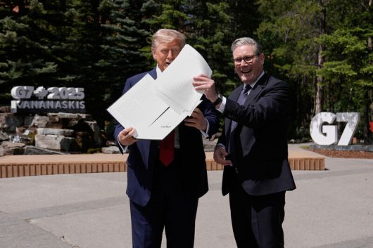 도널드 트럼프 미국 대통령이 지난 16일 키어 스타머 영국 총리와 영미 무역 협정을 체결하고 언론인들과 대화를 하고 있다. AP연합뉴스 |