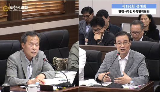 포천시의회 서과석(왼쪽) 의원이 18일 포천도시공사 소관 행정사무감사에서 도시공사의 역할과 기능에 대해 지적하고 있다. |