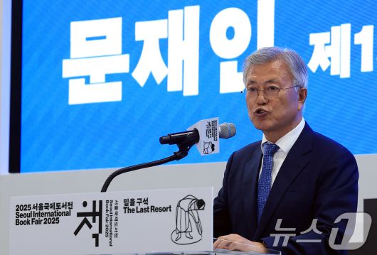 (서울=뉴스1) 박정호 기자 = 문재인 전 대통령이 18일 오후 서울 강남구 삼성동 코엑스에서 열린 2025 서울국제도서전 한국에서 가장 좋은 책 시상식에서 축사를 하고 있다. 2025.6.18/뉴스1pjh2035@news1.krCopyright ⓒ 뉴스1. All rights reserved. 무단 전재 및 재배포, AI학습 이용 금지.