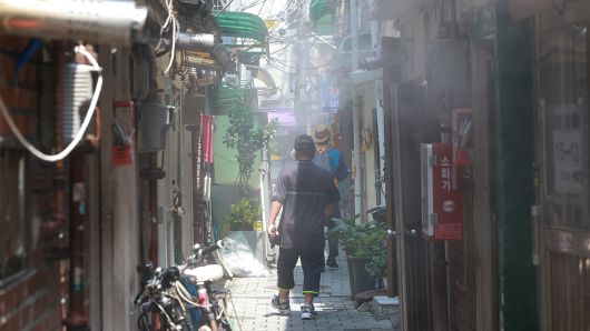 ▲ 무더운 날씨를 보인 18일 서울 종로구 돈의동 쪽방마을에 쿨링포그가 작동되고 있다.