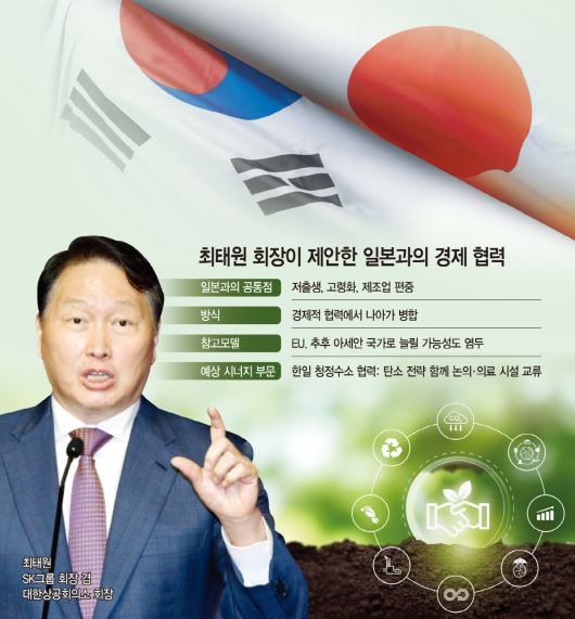 올 들어 최태원 회장이 주창해 온 한일 경제협력에 다시 관심이 쏠리는 배경이다. 지난 4월 최 회장은 서울 여의도 국회사랑재에서 열린 국회 미래산업포럼 발족식에서 경제적 사이즈를 키우기 위해 일본과 경제적 협력을 넘어 병합을 생각할 수 있다고 밝혔다. 미국이나 중국처럼 큰 나라와 병합하는 것은 흡수되는 형태이기 때문에 일본이 적당하다는 설명이다.