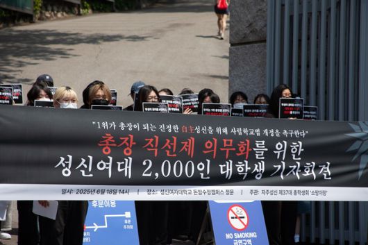 성신여대 제37대 총학생회 '소망이랑'은 18일 오후 서울 성북구 성신여대 돈암수정캠퍼스 정문 앞에서 기자회견을 열고 "지난 2022년 제12대 총장 선거 당시 성신학원 이사회가 2위 득표자를 정당한 설명 없이 선임해 학내 민주주의가 훼손됐다"며 "반민주적 총장 선거 결과를 맞닥뜨려야 했던 이유는 성신학원 정관에서 이사회의 총장 선임권을 보장하고 있기 때문"이라고 규탄했다.