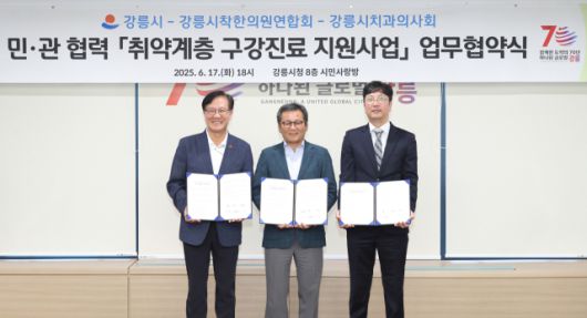 강원특별자치도 강릉시(시장 김홍규)는 지난 17일 오후 6시 시청 8층 시민사랑방에서 강릉시착한의원연합회(회장 김남동), 강릉시치과의사회(회장 박민)와 함께 '취약계층 구강진료 지원사업' 추진을 위한 업무협약을 체결했다고 18일 밝혔다.