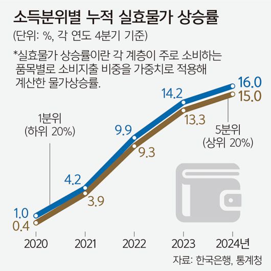 한은은 “생활물가 상승이 누적되면 취약계층의 생활비 부담이 가중되고 소득계층 간 인플레이션 불평등이 심화한다”고 지적했다. 실제로 소득 1분위(하위 20%) 계층이 체감하는 누적 실효물가상승률은 지난해 4분기 16%로 소득 5분위(상위 20%)의 15.0%보다 높았다.