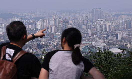 18일 서울 남산을 찾은 관광객이 도심을 바라보고 있다. 뉴스1 |
