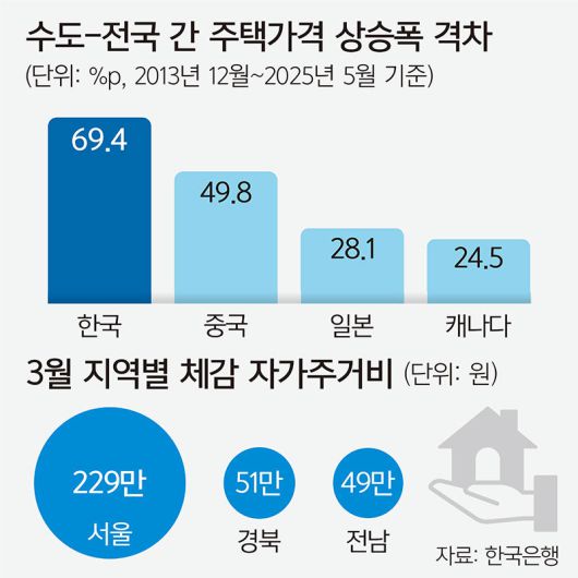 보고서에 따르면 코로나19 팬데믹(세계적 대유행) 이후 대부분 국가에서 주택 공급 축소, 금융 완화 정책 등의 영향으로 집값이 크게 올랐지만 한국은 주요국과 비교해도 유독 수도권에 집중해서 이런 현상이 나타났다. 2013년 12월∼2025년 5월 중 수도와 전국 간 주택가격 상승폭 격차는 한국이 69.4%포인트로 중국(49.8%포인트), 일본(28.1%포인트), 캐나다(24.5%포인트) 등을 압도했다. 이는 연구진이 서울 등 주요 도시의 주택 가격지수를 전국의 지수로 나눠 양극화 정도를 추정한 결과다.