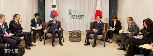한·일 정상 뒤 엇갈린 국기 이재명 대통령과 이시바 시게루 일본 총리가 17일(현지시간) 캐나다 앨버타주 캐내내스키스의 주요 7개국(G7) 정상회의장에서 한·일 정상회담을 하고 있다. 정상회담 관례에 따라 호스트 국가를 맡은 한국의 태극기가 상석(오른쪽)에 배치된 반면, 손님 배려 차원에서 오른쪽 자리에 이시바 총리가 앉았다. 캐내내스키스 | 김창길 기자 cut@kyunghyang.com |