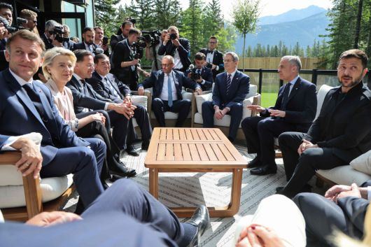 트럼프 떠나고 남은 정상들 볼로디미르 젤렌스키 우크라이나 대통령(앞줄 오른쪽)이 17일(현지시간) 캐나다 앨버타주 캐내내스키스에서 열린 G7 정상회의에서 각국 정상들과 대화하고 있다. AFP연합뉴스 |