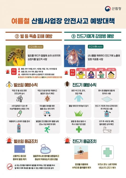 특히 지방산림청, 휴양림관리소, 산림안전특임관 등이 현장에서 활용할 수 있도록 리플릿을 제작하고 진드기 기피제, 이온음료 분말가루, 휴대용 방석 등 안전물품과 함께 배부할 예정입니다.