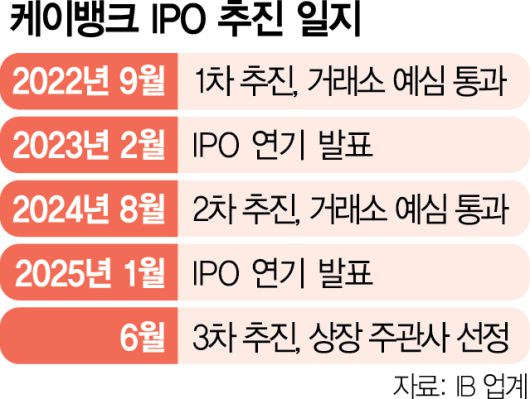 추후 관건은 대형 공모주 시황 회복이다. 희망 밴드 기준 시가총액이 4조 1039억~5조 6634억 원이었던 DN솔루션즈가 올 4월 수요예측에서 부진한 결과로 IPO를 미루는 등 대형 공모주 시장은 얼어붙어 있다. 케이뱅크는 상장이 무산되면 주주 간 계약에 따라 FI가 동반매각청구권(드래그 얼롱)과 매수청구권(풋옵션)을 비씨카드를 상대로 행사할 수 있다. 계약상 시한인 내년 7월까지 증시에 올라야 비씨카드의 재무 부담이 줄어든다. 케이뱅크 관계자는 “하반기 중 한국거래소에 상장 예비 심사 청구서를 제출할 계획”이라고 말했다.
