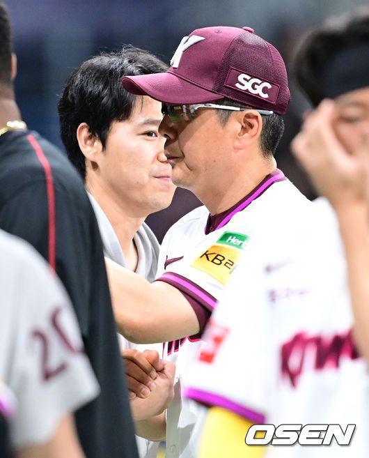 [OSEN=고척, 최규한 기자] 18일 서울 고척스카이돔에서 ‘2025 신한 SOL Bank KBO리그’ 키움 히어로즈와 SSG 랜더스의 경기가 열렸다. 홈팀 키움이 선발 하영민의 6이닝 1실점 역투를 앞세워 3-2로 승리하며 6연패 탈출에 성공했다. 경기를 마치고 승리투수 키움 하영민과 홍원기 감독이 인사를 나누고 있다. 2025.06.18 / dreamer@osen.co.kr