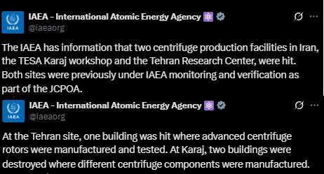 국제원자력기구(IAEA)는 18일(현지시간) SNS(소셜미디어) X 공식 계정을 통해 이란 수도 테헤란의 테헤란연구센터(TRC)와 테헤란 인근 카라지의 공장이 이스라엘군의 공습을 받았다고 밝혔다. IAEA는 "테헤란연구센터에서는 첨단 원심분리기 로터(Rotor)를 생산하고 시험하던 한 건물이 타격을 받았고, 카라지에서는 다양한 원심분리기 부품을 제조하던 건물 2채가 파괴됐다"고 설명했다.