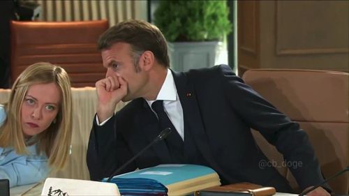 마크롱 대통령 귓속말에 눈알 굴리는 멜로니 총리 |