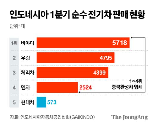특히, 인도네시아의 전기차 혈투가 뜨겁다. 동남아 최대 자동차 시장인 인도네시아는 지난해 전기차 판매 4만3188대를 기록하며 전년 동기 대비 150% 성장했다. 이같은 성장세는 중국 전기차 업체들이 주도했다. 인도네시아자동차공업협회(GAIKINDO)에 따르면 올해 1분기(1~3월) 순수전기차 판매량 1위부터 4위까지 모두 중국 브랜드가 차지했다. BYD가 5718대를 판매해 1위를 차지했고, 우링(4795대), 체리차(4399대), 덴자(2524대)가 뒤를 이었다. 5위에 오른 현대차 판매량(573대)은 BYD와 격차가 10배에 달한다.