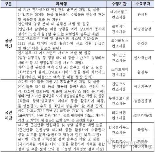 수입물품 안정성 판단, 112 신고 접수와 출동지원 등 공공업무를 혁신할 수 있는 서비스부터 맞춤형 아이돌봄, 공정 하도급계약서 작성 지원 등 국민이 체감할 수 있는 서비스 등 10개 사업이 신규로 진행된다. 각 과제는 연간 9억원 규모로 2년간 지원되며 올해는 부처 데이터를 학습해 서비스를 개발하고 이후 부처 테스트베드에 실증을 거쳐 실제 현장에 적용할 방침이다.