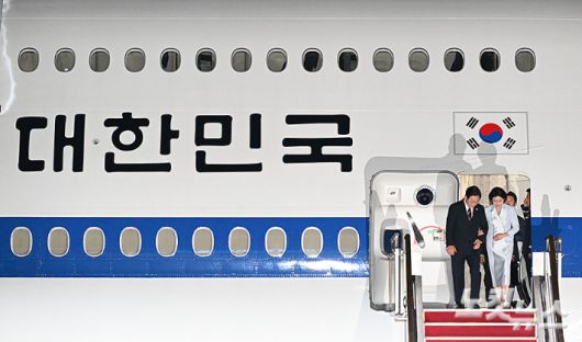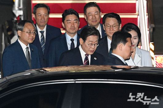 이재명 대통령과 부인 김혜경 여사가 캐나다에서 열린 주요7개국(G7) 정상회의 참석을 마친 후 19일 새벽 경기도 성남 서울공항을 통해 귀국하고 있다.