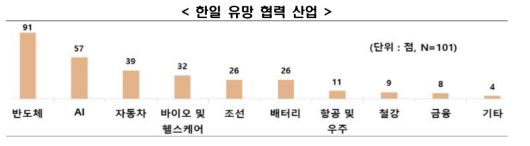 일본과 협력했을 때 시너지 효과가 기대되는 산업으로는 △반도체 △AI 등 첨단산업을 비롯해 △자동차 △바이오·헬스케어 △조선 및 배터리 등으로 조사됐다.