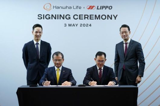 김동원 한화생명 최고글로벌책임자(왼쪽부터), 여승주 한화생명 대표, 아드리안 수헤르만 리포그룹 MPC대표, 존 리아디 리포그룹 대표가 지난해 5월 인도네시아 자카르타에서 노부은행 주식매매계약을 체결하고 있다. [사진=한화생명] |