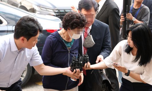 윤석열 전 대통령의 장모 최은순 씨(가운데)가 지난 2023년 7월 21일 경기도 의정부시 가능동 의정부지방법원에서 통장 잔고증명 위조 등 혐의 관련 항소심 재판을 위해 법정으로 이동하고 있다. 연합뉴스 |