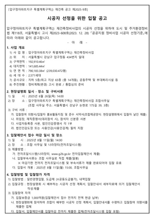 압구정 6개 구역 중 가장 먼저 입찰공고에 돌입한 2구역은, 수년간 재건축을 기다려온 이 일대 특성상 조합원들의 기대감이 크다. 특히 서울시와의 사전 협의를 통해 65층 초고층 설계안이 구체화된 만큼, 이번 입찰이 사업 추진의 신호탄 역할을 한다.