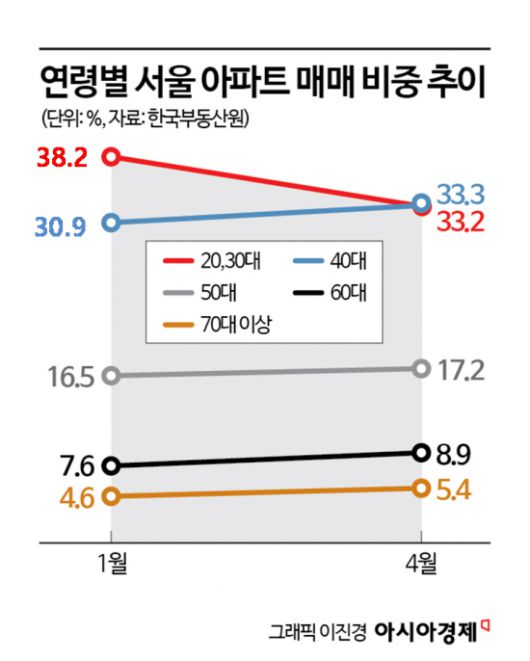 서울 아파트 산 중장년층의 비중은 자연스레 늘었다. 특히 40대의 비중이 가장 큰 폭으로 상승했다. 올해 1월부터 4월까지 40대 매입 비중은 30.9%에서 33.3%로 2.4%포인트 상승했다. 50대도 16.5%에서 17.2%로 소폭 상승했다. 60대와 70대 이상도 각각 7.6%에서 8.9%로, 4.6%에서 5.4%로 올랐다.