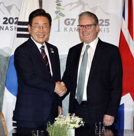 이재명 대통령이 17일(현지시간) 캐나다 앨버타주 캐내내스키스 주요 7개국(G7) 정상회의장에서 키어 스타머 영국 총리와 한영 정상회담 전 악수하고 있다. 연합뉴스 |