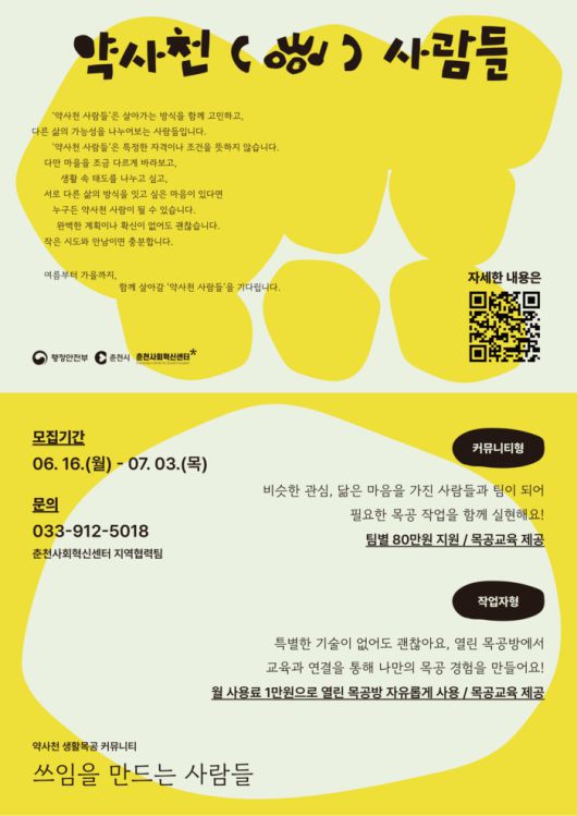 시는 춘천사회혁신센터(센터장 박정환)와 함께 ‘약사천 사람들’ 커뮤니티 사업을 본격 추진한다. ‘약사천 사람들’은 △쓰임을 만드는 사람들 △일상을 만드는 사람들 △방식을 만드는 사람들 등 세 가지 유형으로 구성되며, 총 30개 커뮤니티를 모집해 운영할 예정이다.