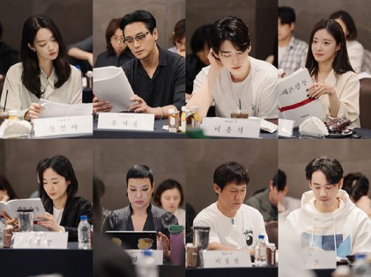 신민아, 주지훈, 이종석, 이세영, 이봉련, 박호산, 정영주, 남윤호가 '재혼 황후' 대본리딩에 임하고 있다. [사진=월트디즈니 컴퍼니 코리아] |