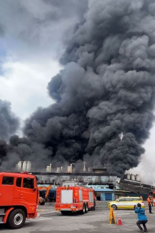지난달17일 오전 발생한 화재로 금호타이어 광주공장에서 검은 연기가 치솟고 있다. 송보현 기자 |