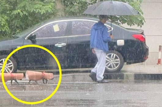 사진 속에는 비 오는 날 우산을 쓴 중년 남성의 뒤를 졸졸 따라가는 강아지 두 마리가 포착됐다. 우비 대신 돗자리를 머리부터 등까지 두르고 걷는 강아지들의 모습은 귀엽고도 묘하게 우스꽝스러워 시선을 끌었다.