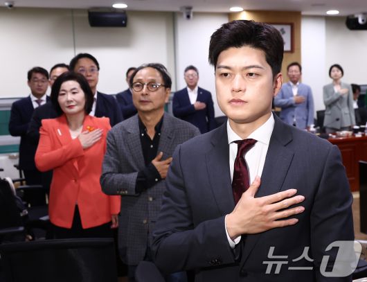 국민의힘 김용태 비상대책위원장을 비롯한 의원들이 19일 오전 서울 여의도 국회 의원회관에서 열린 당의 혁신을 바라는 의원 모임 주최 '대선 패배 후 민심과 국민의힘 혁신방안' 토론회에서 국기에 경례하고 있다. 2025.6.19/뉴스1 ⓒ News1 김민지 기자 |