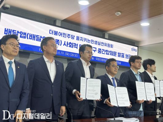 19일 서울 여의도 국회의원회관에서 열린 중간합의문 발표 브리핑에는 민병덕 더불어민주당 을지키는민생실천위원회 위원장, 이강일 더불어민주당 을지키는민생실천위원회 책임의원, 김범석 우아한형제들 대표, 김준형 공정한 플랫폼을 위한 사장협회 공동의장, 김진우 전국가맹점주협의회 공동의장 등이 참석했다.