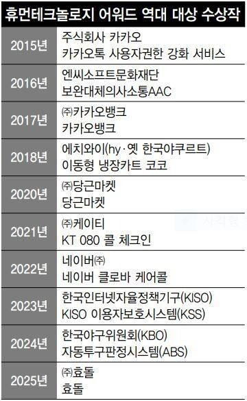 휴먼테크놀로지어워드(HTA) 첫해(2015년) 대상은 다음카카오의 ‘카카오톡 사용자 권한 강화’ 서비스가 받았다. 재초대 거부와 비밀채팅 기능을 도입한 서비스로 학교폭력 등 시대적 요구에 반응해, 기술의 편리함 이면에 숨은 부작용을 고민하고 개선했다는 점에서 휴먼테크놀로지어워드가 추구하는 가치와 부합한다. 2020~2022년은 코로나19라는 재난 상황에 맞서 ‘케이티(KT) 080 콜 체크인’(2021년 대상), ‘당근마켓’(2020년 대상) 등 ‘좀 더 인간적인 삶’을 가능하게 해준 기술들이 주목을 받았다. 이처럼 역대 수상작은 그 시대가 직면한 핵심 문제를 해결하려는 노력에 주어졌다.