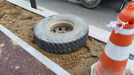 사고현장에서 떨어져 나간 덤프트럭 바퀴. 과천에서 주행 중이던 25톤 트럭에서 빠진 바퀴가 인도를 덮쳐 여고생이 중상을 입고 46일째 의식을 찾지 못하고 있다. 경찰은 운전자를 형사 입건하고 차량 정비 이력까지 조사 중이다. 뉴스1 |