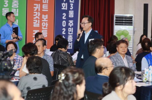 개청 30주년 금천구 ‘주민자치’ 행사 풍성 - 유성훈 금천구청장이 지난해 진행한 독산3동 주민총회에서 주민자치회 운영 방향에 대해 설명하고 있다. 금천구 제공 |