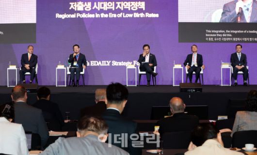 [이데일리 방인권 기자] 안종범 정책평가연구원장과 김영록 전라남도지사, 김학봉 경상북도 행정부지사, 박재완 전 기획재정부 장관, 이용섭 전 광주시장(왼쪽부터)가 19일 서울 중구 장충동 서울신라호텔에서 열린 '제16회 이데일리 전략포럼'에서 '저출생 시대의 지역정책'이란 주제로 대담을 하고 있다.