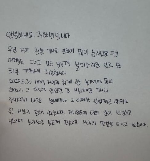 주학년은 19일 자신의 SNS에 자필 편지를 통해 "지난 5월 30일 새벽 지인과 함께한 술자리에 동석했고, 그 자리에 있었던 건 사실이지만 기사나 루머에서 나오는 성매매나 그 어떠한 불법적인 행위를 한 사실이 전혀 없다"고 밝혔다.