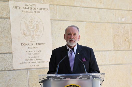 이스라엘 예루살렘에 있는 미국 대사관 앞에서 마이크 허커비 대사과 지난달 9일(현지시각) 기자회견을 하고 있다. 예루살렘/EPA 연합뉴스 |