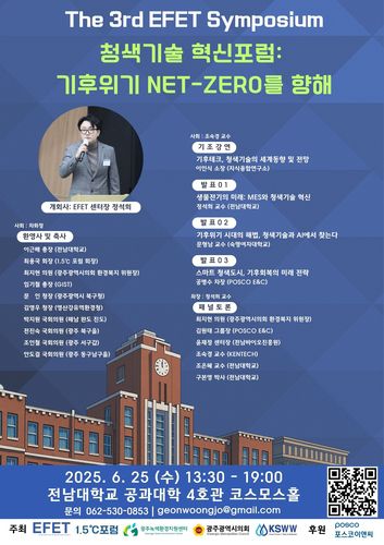 [SDG13 기후위기 포럼] 전남대학교는 오는 25일 오후 1시 30분, 전남대 공과대학 4호관 코스모스홀에서 '제3회 EFET 심포지엄청색기술 혁신포럼: 기후위기 NET-ZERO를 향해'를 개최한다고 18일 밝혔다.