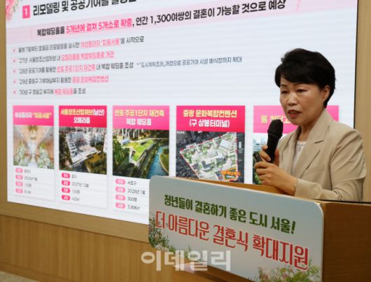 [이데일리 김태형 기자] 19일 서울시청에서 열린 ‘더 아름다운 결혼식’ 확대 지원 계획 발표에서 서울시 관계자가 세부사항을 브리핑하고 있다. 서울시는 결혼식 비용 등으로 어려움을 겪는 예비부부들을 위해 실내외 공공예식장 40곳 추가 조성하고 스드메(스튜디오촬영·드레스·메이크업) 비용 최대 100만원, 무료 건강검진 등을 지원하기로 했다.